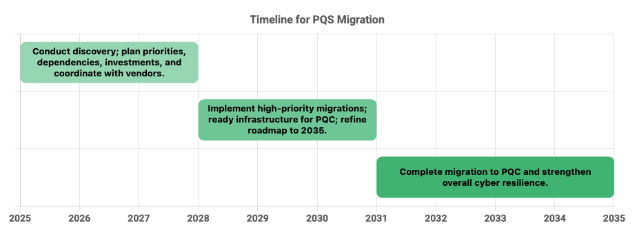 The UK’s National Cyber Security Centre (NCSC) has provided a generalized timeline for migrating IT infrastructure to PQS compliant standards [1].