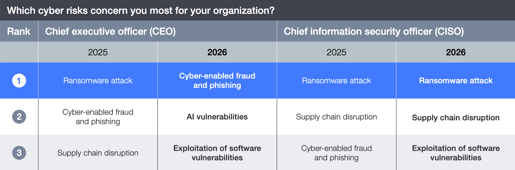 Figure 1: Evolving cyber risk concerns for CEOs and CISOs between 2025 and 2026. (Source: WEF Global Cybersecurity Outlook 2026)